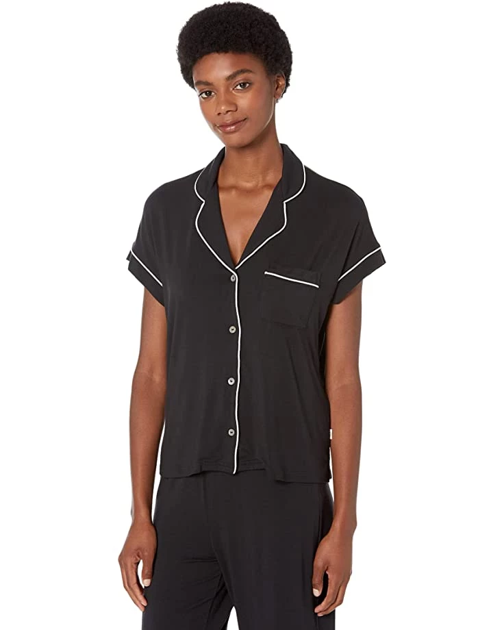 - Sleepwear set top with spread collar, button closure, and left chest patch pocket.